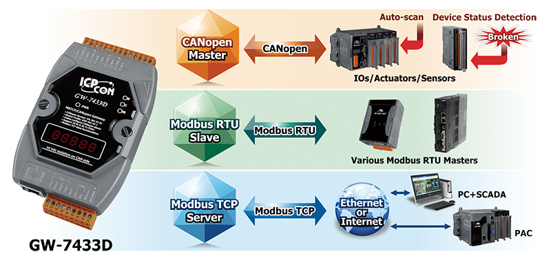The ICP DAS GW-7433D provides a communication transformation between CANopen protocol and Modbus/TCP and RTU protocols. It solves a mission-critical problem by connecting existing CANopen network with Modbus master devices. ...