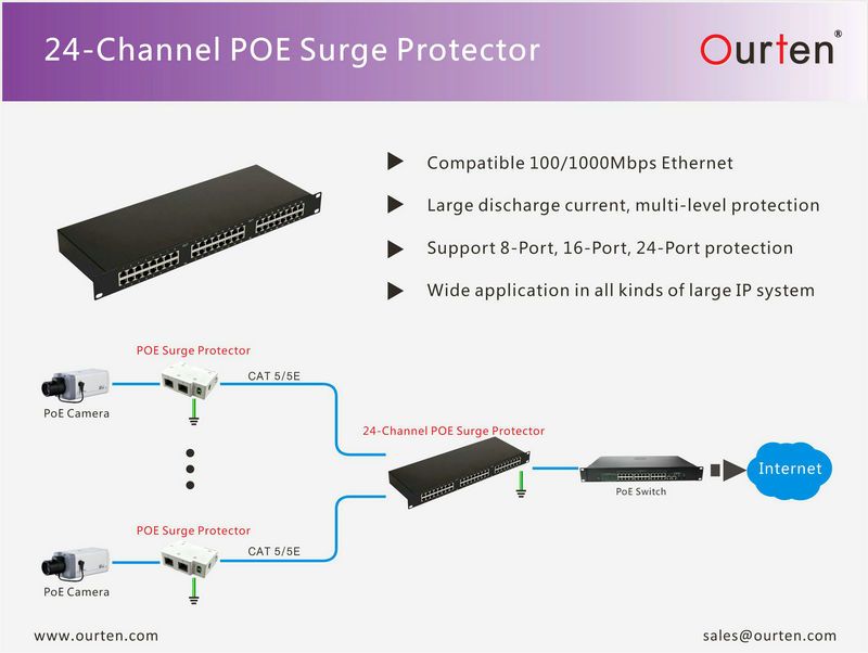 The Ourten SP-24POE/1000 is 24-ch Gigabit PoE surge protector. This model is widely used to 24-Port IP & PoE devices concentrated protection. It adopts a three-stage protection system to suppress overvoltage ...