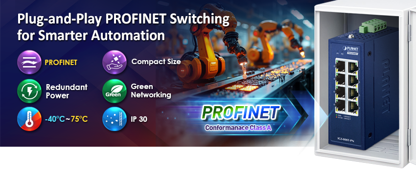 The PLANET IGS-800T-PN is a compact industrial 8-Port 10/100/1000T PROFINET switch that features eight 1000Mbps auto-negotiation ports, IP30-rated rugged but compact case and a wide-ranging redundant power system (9~48V DC ...