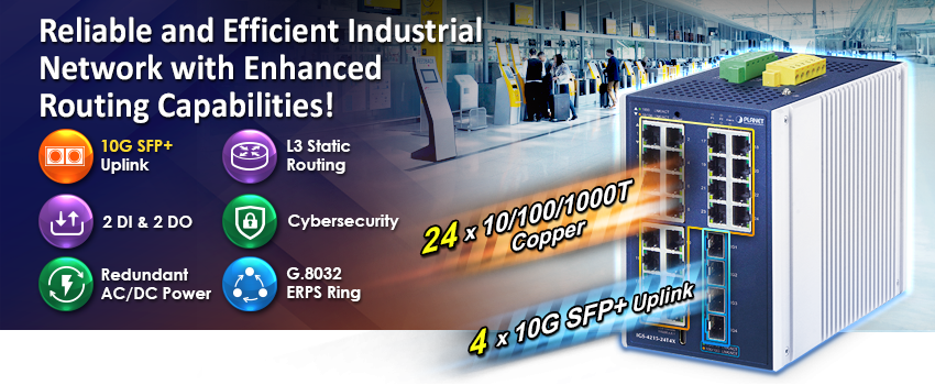 The IGS-4215-24T4X is PLANET's latest addition to their DIN-rail L2/L4 Managed Gigabit switch portfolio, that is designed to thrive in demanding industrial environment. This model combines exceptional performance with cost-efficiency, featuring robust network management ...