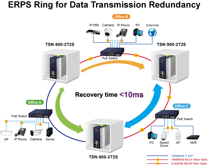 The TSN-900-2T2S also support redundant ring technology and features strong, rapid self-recovery capability to prevent interruptions and external intrusions. This managed media converter incorporates advanced ITU-T G.8032 ERPS (Ethernet Ring Protection Switching) technology, Spanning Tree Protocol (802.1s MSTP), and redundant power input system into customer’s industrial automation network to enhance system reliability and uptime in harsh factory environments. In a simple ring network, the recovery time of data link can be as fast as 10ms.