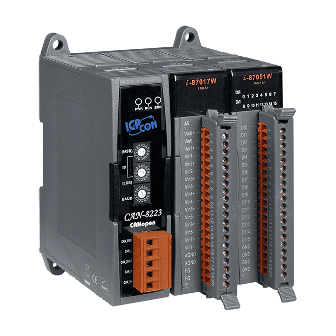 The ICP DAS CAN-8223 main control unit is specially designed for the slave devices of CANopen protocol. It follows the CANopen Spec DS-301 V4.02 and DSP-401 V2.1, and supplies and supplies many features for users, such as dynamic PDO, EMCY object, error output value, SYNC cyclic and acyclic.