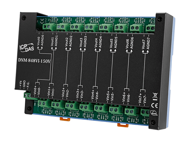 The ICP DAS DNM-848VI series are voltage input attenuator. The maximum input range is from ±10 V / ±80 V / ±150 V can be attenuated to ±10 V.