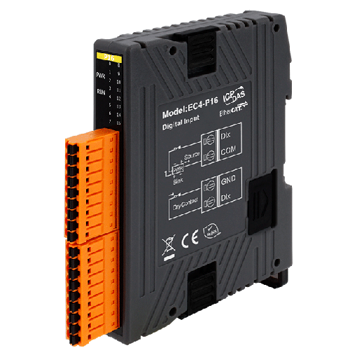 The ICP DAS EC4-P16 is an industrial I/O module designed with a slim-type form factor, featuring 16 isolated digital input channels. It features the EtherCAT protocol, providing a system with higher scalability and fewer cables. Users can check the current input status through LED indicators on the enclosure.