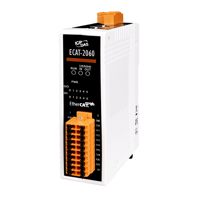 The ICP DAS ECAT-2060 is built-in with isolated 6 digital inputs and 6 relay digital outputs. Users can obtain the output status via the process data, when passed and verified by the conformance test tool, the eligible EtherCAT Master or configurator can simply manipulate and implement it.