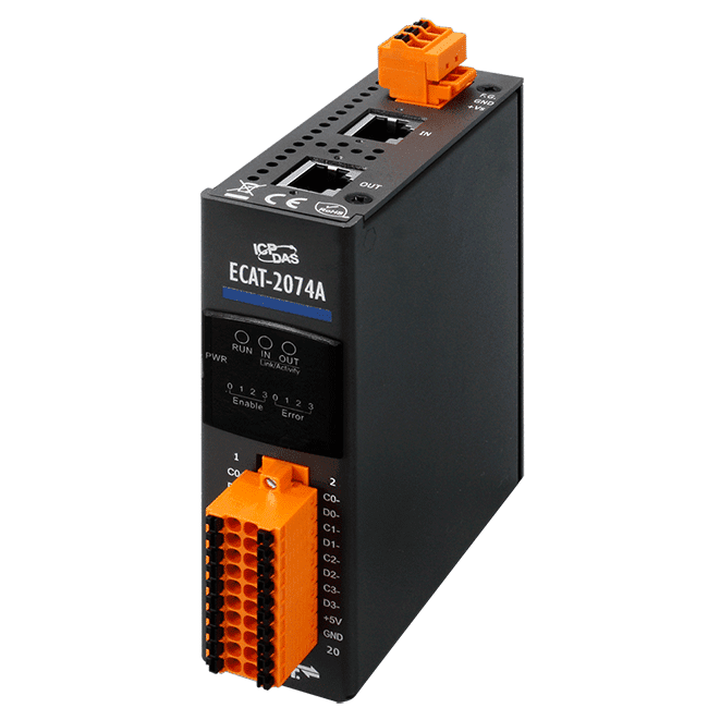 The EtherCAT slave ECAT-2074A is an absolute encoder master. The ICP DAS ECAT-2074A provides four channels and each channel is independent of each other. It supports two serial transmission interfaces: SSI (Serial Synchronous Interface) & BiSS-C (BiSS Continuous Mode).