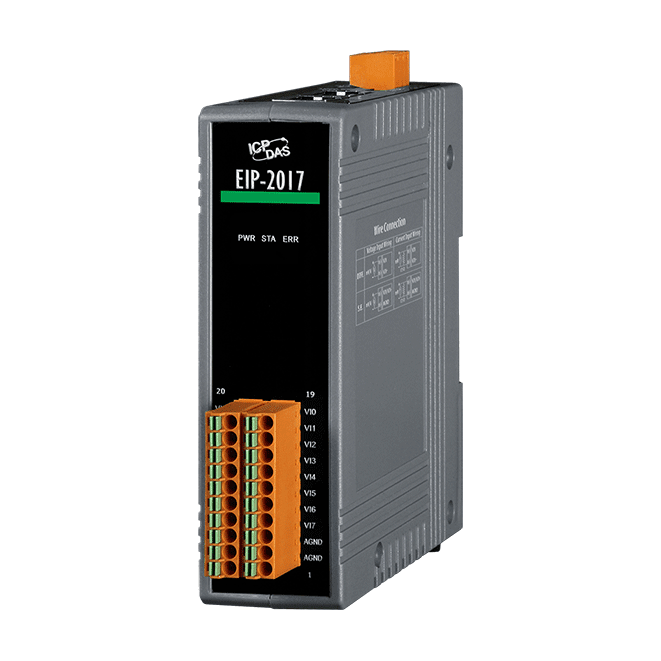 All the modules can be deployed in the network topologies such as star, line or ring. The isolation design protects the EIP-2000 against the harmful interference. The ICP DAS EIP-2017 is an 8-ch differential and 16-ch single-ended analog input module. This module provides a jumper to switch between differential and single-ended mode and supports voltage and current input types. The accuracy of the measurement is less than 0.1% FSR. It is designed as an EtherNet/IP adapter which users to obtain the I/O status and the connection status of the ICP DAS EIP-2017 via the LEDs. In addition, software utility are available to easily configure and test the EIP-2000 modules via Ethernet.