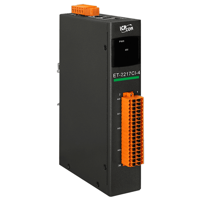 The ICP DAS ET-2217CI-4 is a channel-to-channel isolated analog input module that includes 4 analog input channels. The module provides a programmable input range on all Analog Input channels (±1 V, ±2.5 V, ±5 V, ±10 V, 0 to 20mA, 4 to 20mA, and ±20 mA). Each analog input channel can be configured for an individual input range, providing a high overvoltage protection of 120 VDC and 50 mA overcurrent protection at 110 VDC/VAC. Voltage and current input is software configurable.