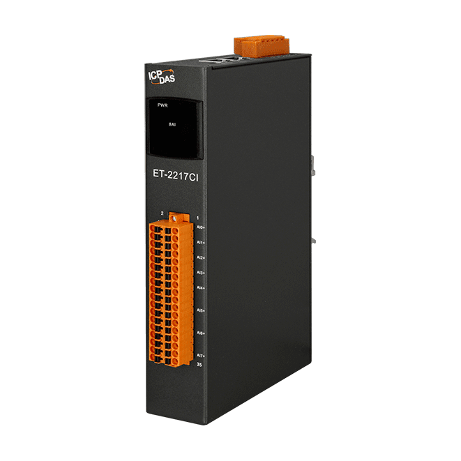 The ICP DAS ET-2217CI is a channel-to-channel isolated analog input module that includes 8 analog input channels. The module provides a programmable input range on all Analog Input channels (±1 V, ±2.5 V, ±5 V, ±10 V, 0 to 20mA, 4 to 20mA and ±20 mA). Each analog input channel can be configured for an individual input range, providing a high over-voltage protection of 120 Vdc and 50mA over-current protection at 110 VDC/VAC. Voltage and current input is software configurable.