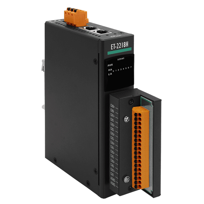 The ICP DAS ET-2218H/S1 is an 8-channel thermocouple input module that provides 100Hz high-speed measurement and open wire detection for each channel. The module supports a variety of thermocouple input types, including Type J, K, T, E, R, S, B, N, C, L, M, and LDIN43710, and features an automatic cold-junction compensation function for all channels. The module includes a built-in 2-port Ethernet switch, facilitating a Daisy-chain topology.
