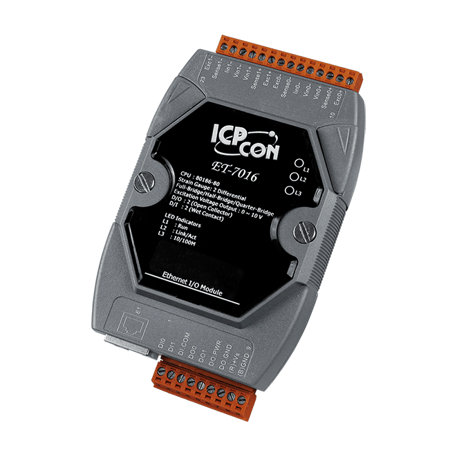 The ICP DAS ET-7016 is a strain gauge module with 2 analog input channels, 1 excitation voltage output channel, 2 digital input channels and 2 digital output channels module. It provides various programmable analog input inputs (+/-1 mV, +/-50 mV, +/-100 mV, +/-500 mV, +/-1 V, and +/-2.5 V) and supports full-bridge, half-bridge, and quarter-bridge.