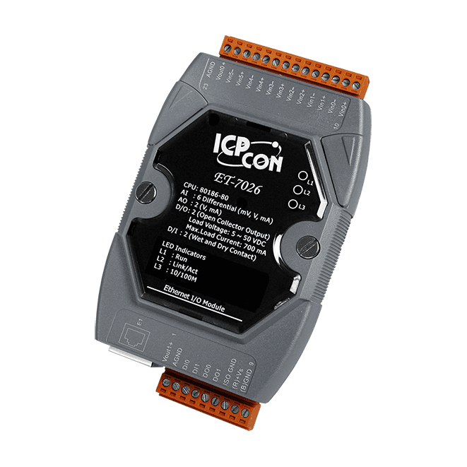 The ICP DAS ET-7026 is a multi-function module with 6-channel analog inputs, 2-channel analog outputs, 2-channel digital inputs and 2-channel digital outputs. It provides various programmable analog inputs (+/-500 mV, +/-1 V, +/-5 V, +/-10 V, +/-20 mA, 0 ~ 20 mA and 4 ~ 20 mA), and analog outputs (+/-5 V, +/-10 V, 0 ~ 20 mA and 4 ~ 20 mA).