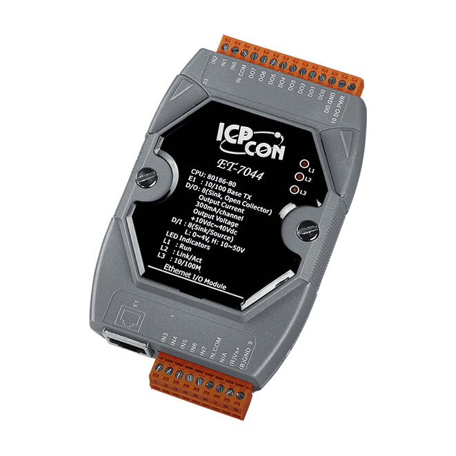 The ICP DAS ET-7044 provides 8 wet contact digital input channels and 8 sink-type digital output channels. It features optical isolation for 3750 Vrms of transient over-voltage protection but doesn’t provide channel-to-channel isolation. Each input channel can be used as a 32-bit counter and each output channel can drive 300 mA load.
