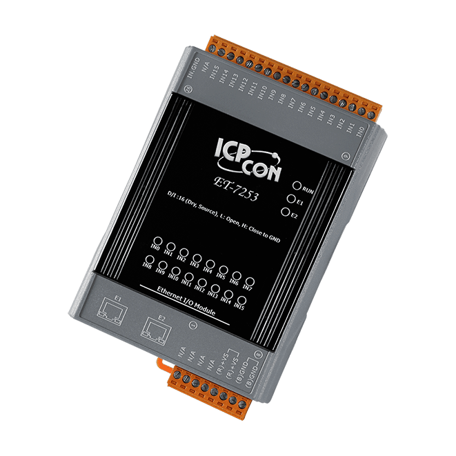 The ICP DAS ET-7253 provides 16 dry contact digital input channels. Each input channel can be used as a 32-bit counter. It features optical isolation for 3750 Vrms of transient overvoltage protection but doesn’t provide channel-to-channel isolation. It can safely be used in applications where hazardous voltages are present.