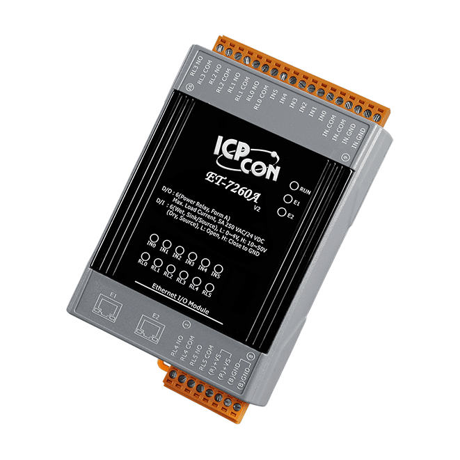 The ICP DAS ET-7260A provides 6 wet contact digital input channels and 6 form A electro-mechanical relays. In addition, each digital input accepts either dry contact or wet contact. It features optical isolation for 3000 VDC of transient over-voltage protection and doesn’t have channel-to-channel isolation. Each input channel can be used as a 32-bit counter.