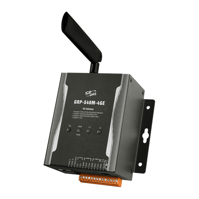 The ICP DAS GRP-540M-4GE is a 4G gateway for Ethernet or serial port. With the GPS, the GRP-540 can use as a GPS tracking system. In Machine-to-Machine applications , this gateway is used to transfer data from remote I/O modules, Modbus data or videos from IP cameras via 4G/3G/2G. With its high-performance CPU, the ICP DAS GRP-540M-4GE can handle a large amount of data and are suitable for harsh industrial environments. The GRP-540M-4GE is equipped with the 3G module, Ethernet interface, CAN Bus, and GPS module.