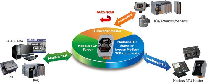 Compared to the GW-7243D, the GW-7434D offers a predefined Master connection Set function and Group 2 only Server function as a DeviceNet master, and enables accessing the DeviceNet slaves automatically and cyclically. PLCs, HMI or SCADA can access DeviceNet slaves and simultaneously communicate with the Modbus slaves or COM-based devices connected with the RS-232 or RS-485 port of the GW-7434D device, the ICP DAS GW-7434D can be the Modbus TCP server or VxComm server to exchange the data between these devices.