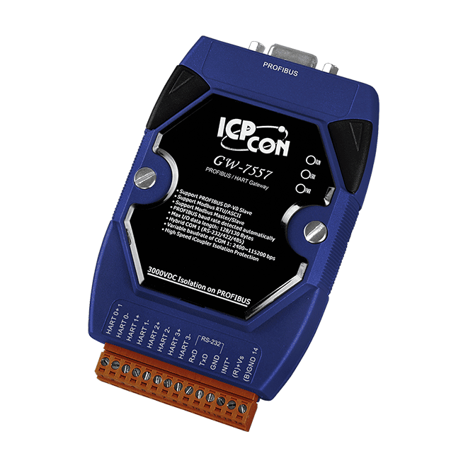 The ICP DAS GW-7557-B Gateway is specially designed for the slave device of PROFIBUS DP protocol. It allows the PROFIBUS master to access the HART slave devices such as actuators, current output devices and other devices. In addition, utility software are available for users to configure the ICP DAS GW-7557-B; this module offer users ability to seamlessly integrate HART slave devices into PROFIBUS network.