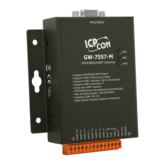 The ICP DAS GW-7557-M Gateway is specially designed for the slave device of PROFIBUS DP protocol. It allows the PROFIBUS master to access the HART slave devices. These HART slave devices may be a transmitter, an actuator, a current output device and so forth. In addition, we also provide the utility software for users to configure the GW-7557-M. By using this module, users can put their HART slave devices into PROFIBUS network very easily.