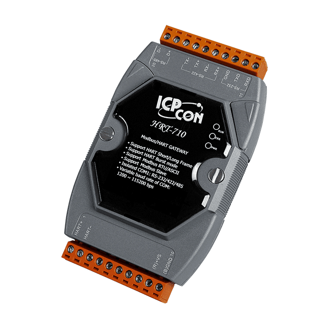 The ICP DAS HRT-710 Gateway is specially designed for the master device of HART protocol. It allows the Modbus master to access the HART devices such as transmitters, actuators and other. In addition, software utility, HG_Tool, are available for module configuration and HART device diagnosis.