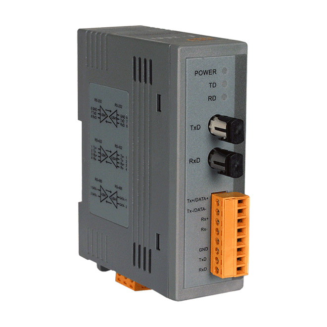 The ICP DAS I-2541 is an RS-232/422/485 to fiber optic converter that secures data transmission by using fiber optic transmission to provide immunity from EMI/RFI interference.