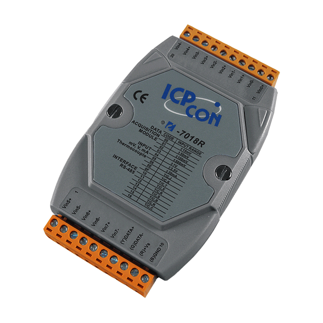 The ICP DAS I-7018 is an 8-channel Analog Input module that provides current and voltage input, as well as thermocouple input. The I-7018R is an upgraded version of the I-7018 that includes an extremely high-quality protection mechanism where the overvoltage protection can be as high as 240 Vrms.
