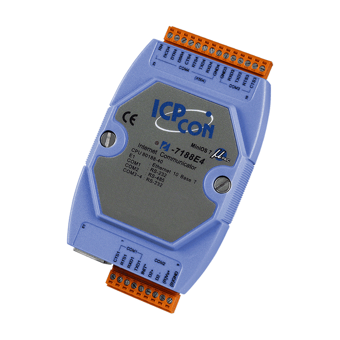 The I-7188E4(D) is equipped with 3 RS-232 ports and 1 RS-485 port. The removable on-board terminal block connector is designed for easy and robust wiring in industrial situations.