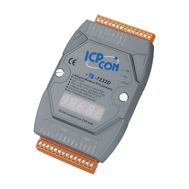 The ICP DAS I-7232D is a CANopen slave to Modbus RTU master gateway, and allows a CANopen master to have ability to access the Modbus slave devices. In the CANopen network, the I-7232D is a NMT slave, SDO server, PDO producer, and PDO consumer. From the view of the Modbus network, it is a Modbus RTU master which polls all the predefi ned data of the Modbus RTU slaves, and bypass the CANopen control commands to the Modbus slaves.