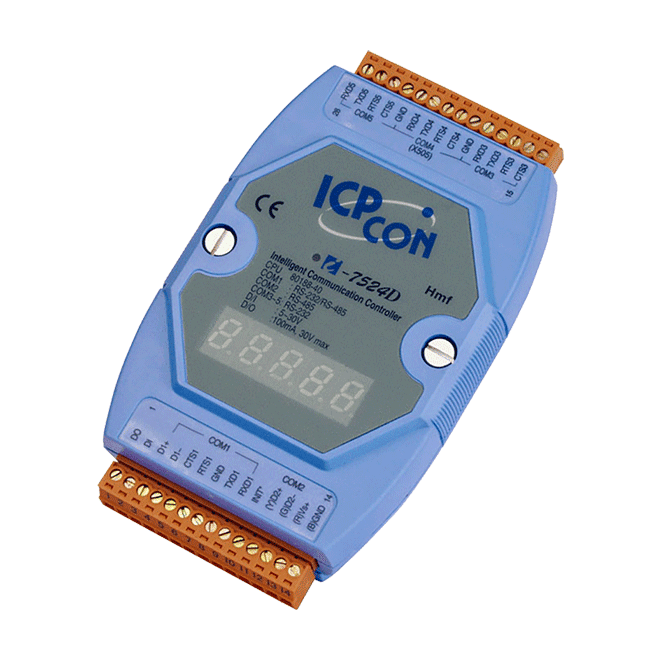 I-7524D Addressable RS-485 to 4 x RS-232/RS-485 Converter with 1 DI, 1 DO & 7-Segment LED Display