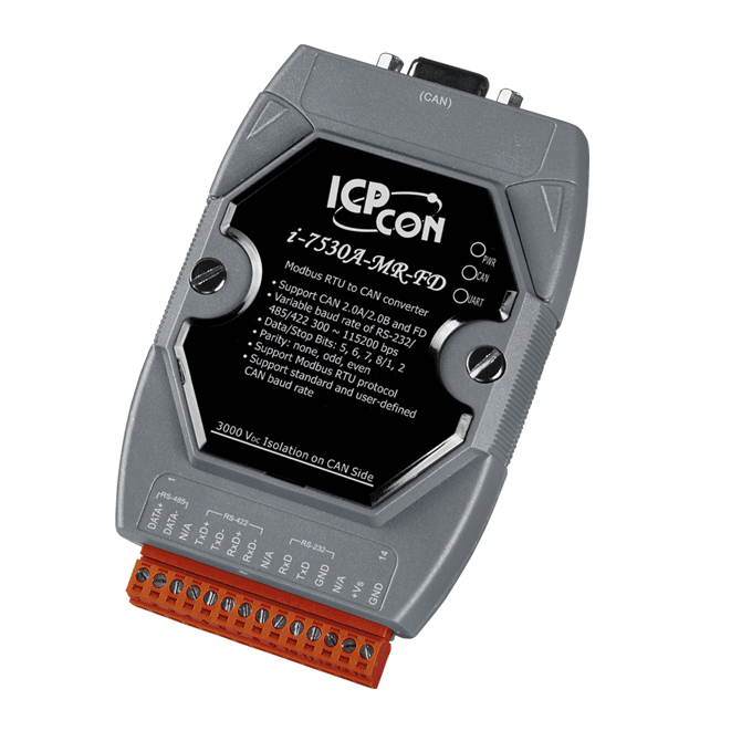 The ICP DAS I-7530A-MR-FD supports Modbus RTU protocol on RS-232/422/485 port, it is a Modbus RTU to CAN converter, it supports CAN2.0A/2.0B and CAN FD, and provides user-defined CAN Bus communication baud rate (arbitration field: 10Kbps to 1Mbps, CAN FD data field: 100Kbps to 10Mbps).