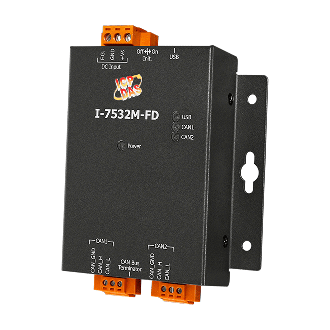 The ICP DAS I-7532M-FD is a local CAN/CAN FD (CAN with Flexible Data-Rate) bridge used to establish a connection between two CAN/CAN FD networks. It can increase the bus loading capacity, extend communication distance, connect CAN/CAN FD networks with different baud rate and support messages transform between CAN and CAN FD networks.