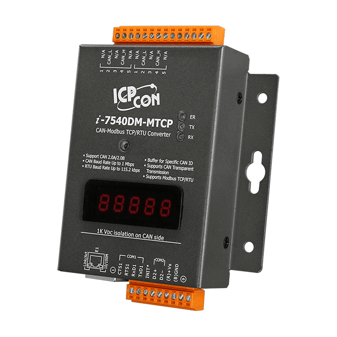 The ICP DAS I-7540DM-MTCP is helpful for data exchanging between the Modbus devices and CAN devices. I-7540DM-MTCP is a Modbus TCP server and acts as slave device in Modbus RTU network. It supports four communication modes: Modbus TCP, Modbus RTU, CAN-Ethernet Convert and Pair connection.