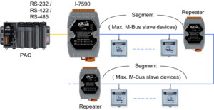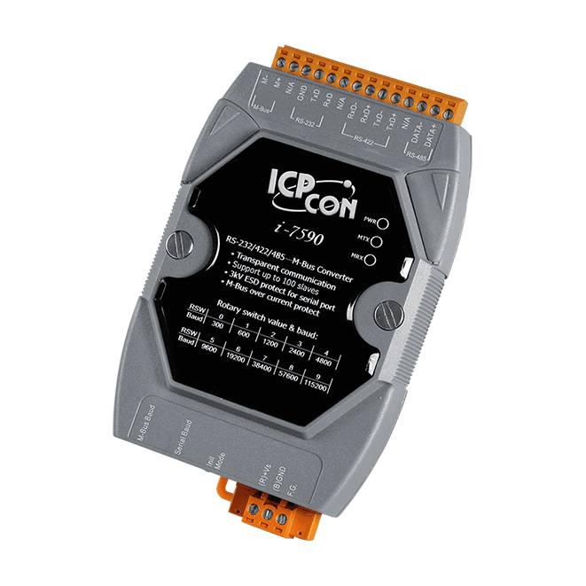 M-Bus (“Meter-Bus”) is a standard for remote reading of meters. It is usable for most types of consumption meters as well as for various sensors and actuators. The ICP DAS I-7590 is specially designed for M-Bus slave device. It is a serial bus to M-Bus converter that offers RS-232, RS-422 and RS-485 three kinds of communication way. The ICP DAS I-7590 has two rotary switches, one for serial port baud and the other for M-Bus port baud. The I-7590 uses transparent transmission between serial bus and M-Bus communication.