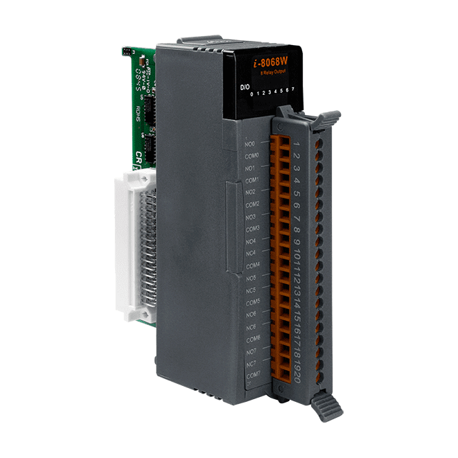 The ICP DAS I-8068W provides 4 Form A power relay output channels and 4 Form C power relay output channels. The I-8068W include 8 LED indicators for monitoring the relay output status.