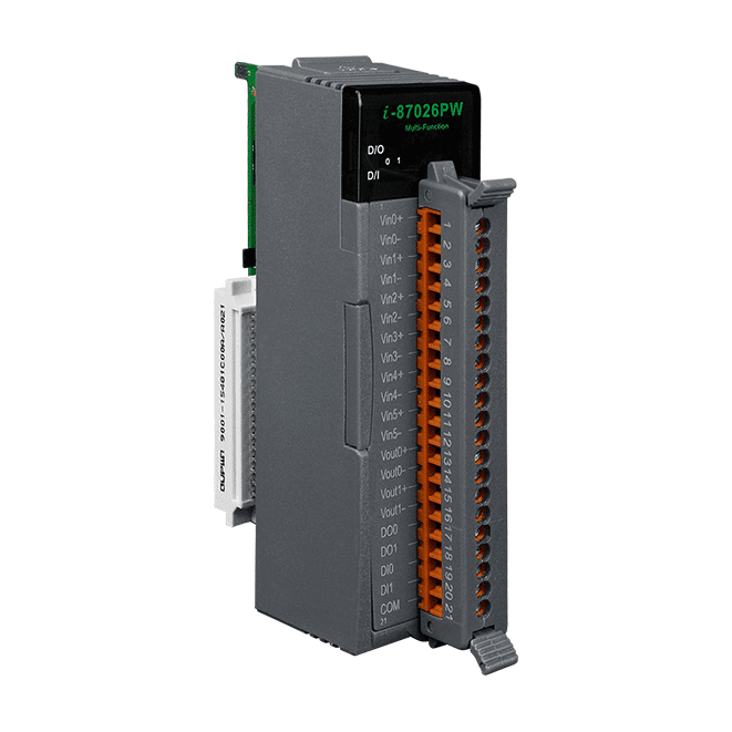 The ICP DAS I-87026PW is a multi-function module that includes 6 analog input channels, 2 analog output channels, 2 digital input channels, 2 digital output channels. It provides a programmable input range on all analog input (+/-150 mV, +/-500 mV, +/-1 V, +/-5 V, +/-10 V, +/-20 mA, 0 ~ 20 mA or 4 ~ 20 mA), analog outputs are 12 bit at +/-5 V, +/-10 V, 0 ~ 20 mA or 4 ~ 20 mA and all digital outputs can be set as alarm output.