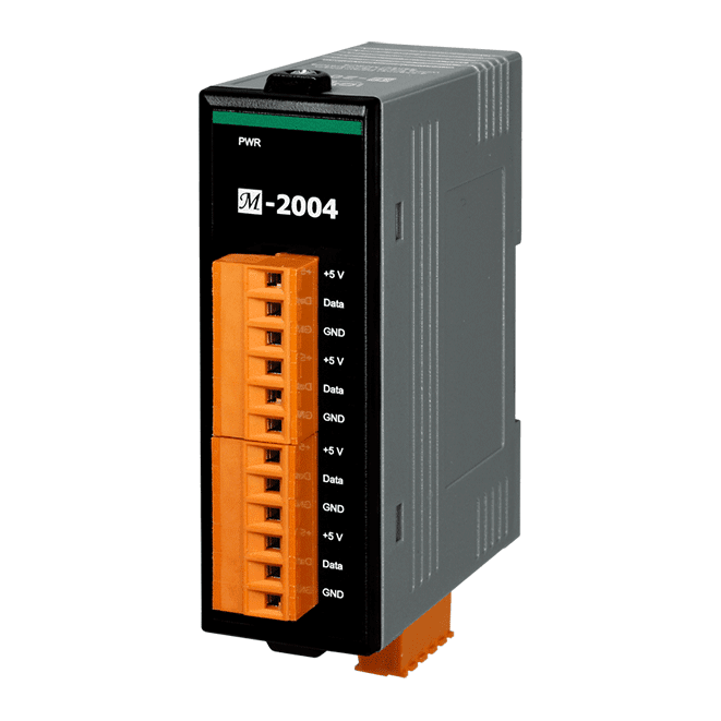The ICP DAS M-2004 is a digital temperature sensor module that provides four ports for 2- or 3 wire DS18B20 digital temperature sensor input. The DS18B20 temperature sensor has a high accuracy of ±0.5°C when measuring temperatures between -10 and + 85°C, with a total measurement range of between -55 and +125°C. Up to 20 DS18B20 sensors can be connected to each port on the ICP DAS M-2004 module in a daisy-chain arrangement with a maximum wiring distance of 100 meters.
