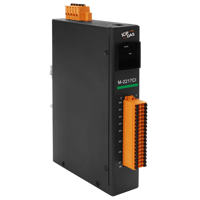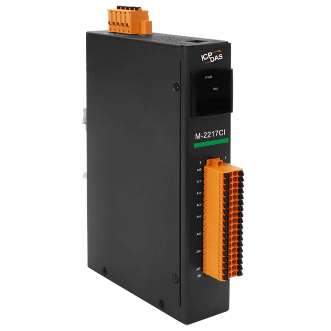 The ICP DAS M-2217CI is a 8-channel analog input module with channel-to-channel isolation. All analog input channels can be individually configured with input ranges including ±1 V, ±2.5 V, ±5 V, ±10 V, 0-20 mA, 4-20 mA, and ±20 mA.
