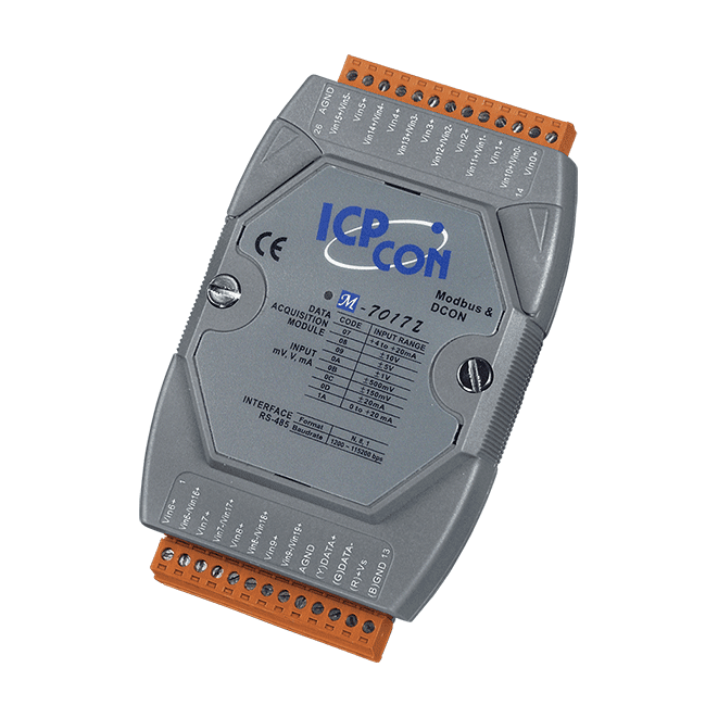 The sampling rate of ICP DAS M-7017Z is adjustable and can be set to either fast or normal mode. The module also features per-channel open wire detection for 4 ~ 20 mA input and provides 4 kV ESD protection as well as 3000 VDC intra-module isolation. The M-7017Z supports both the Modbus RTU and DCON protocols, which can be configured via software, and all hardware specifications are the same as ICP DAS I-7017Z.
