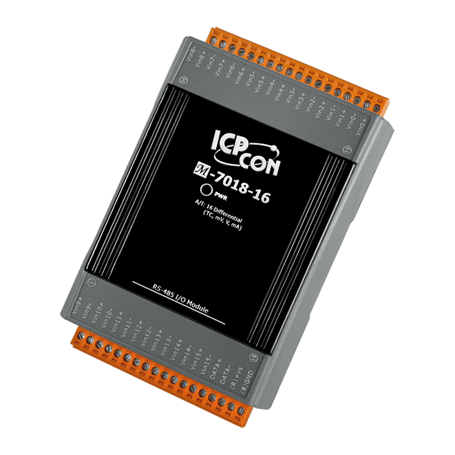 The ICP DAS M-7018-16 is an analog input module with 16 differential analog input channels. The voltage input range can be from ±15 mV to ±2.5 V, the current input range can be either +4 to +20 mA, 0 to +20 mA, or ±20 mA, and types J, K, T, E, R, S, B, N, C, L, M, LDIN43710 thermocouple can be used for the thermocouple input.
