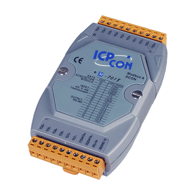 The ICP DAS M-7018R is more suitable for critically harsh environments, and the newly-added open thermocouple detection feature makes the ICP DAS M-7018R more attractive than ever. The M-7018 and M-7018R also features 4 kV ESD protection and 3000 VDC intra-module isolation. The ICP DAS M-7018 and M-7018R supports Modbus RTU protocol and DCON protocol.