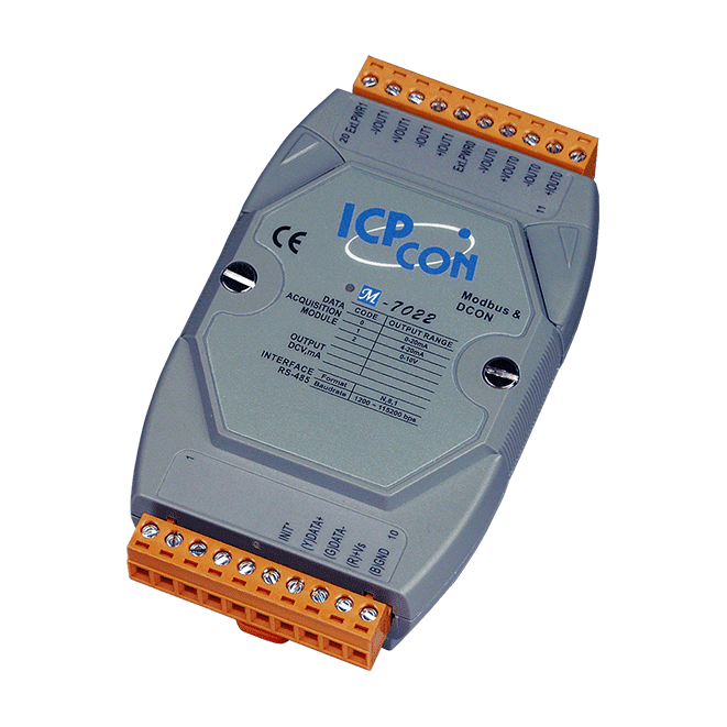 The ICP DAS M-7022 is a 12-bit, 2-channel analog output module that provides current and voltage outputs. The module features 3000 VDC intra-module isolation, and the current output’s power source can be either internal or external via a jumper. Options are also provided to allow power-on and safe values to be set.