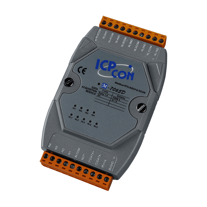 The ICP DAS M-7065/M-7065D provides 4 digital input channels and 5 Form A relay output channels. All digital input channels can be used as 16-bit counters. In addition, the digital input channels can be selected either as sink- or source-type via wire connections. M-7065D provides 9 LED indicators that can be used to monitor the status of the digital input and relay output.