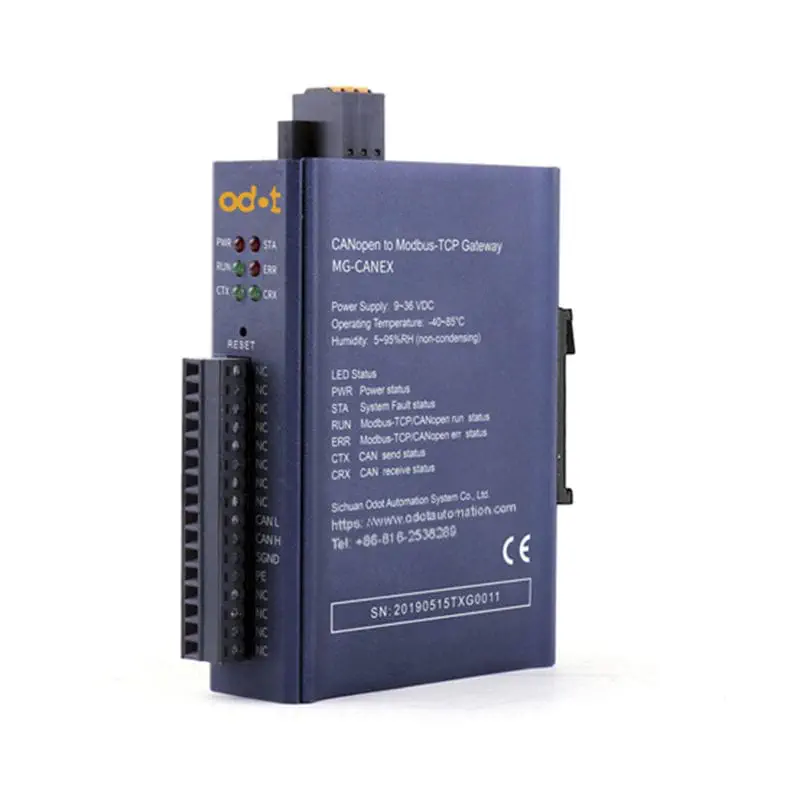 The Odot MG-CANEX is a protocol converter from CANopen to Modbus TCP. The device plays as the master in the CANopen network and it could be connected to the standard CANopen slave devices. The data transmission supports PDO, SDO, and error control supports Heartbeat. It Supports synchronous and asynchronous message sending.