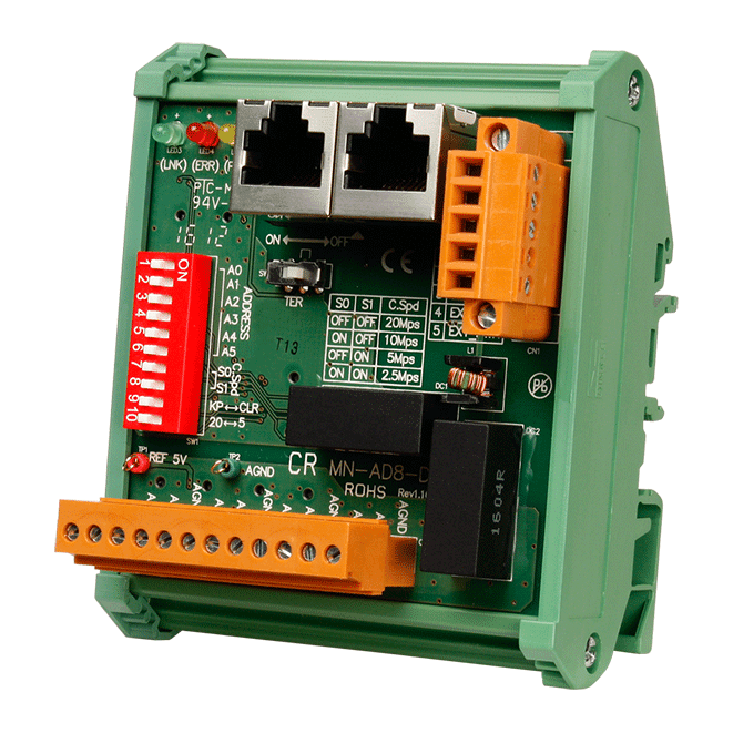 The ICP DAS MN-AD8-DIN is a Motionnet 8-channel analog input I/O module. The max device capacity can be loaded 64 I/O modules on each Motionnet communication port. Thus, each port can be expended into 512 analog input points at once.