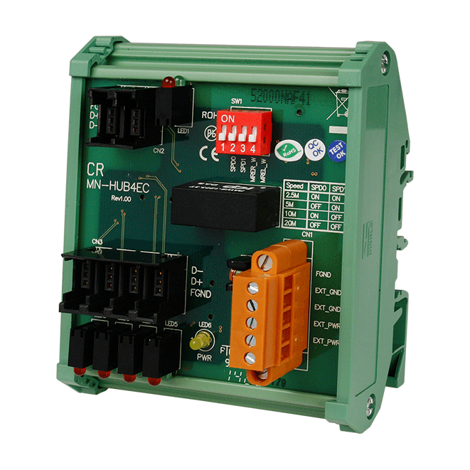 In some user’s application, users may encounter some difficulty in wiring since the standard Motionnet only support daisy-chain topology. The MN-HUB4EC module can help users to use star or tree topology during wiring which not only can make the wiring more easier but also reduce the total wiring distance and cost.