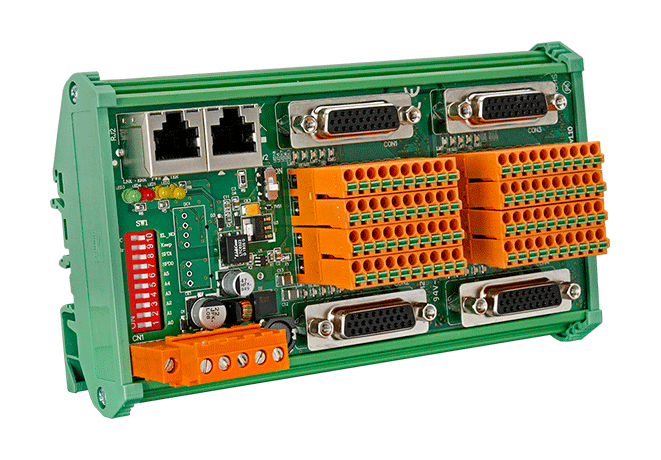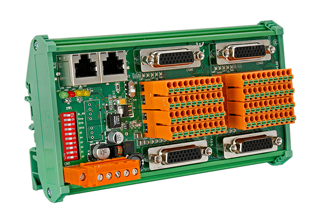 The MN-MP4U-DIN is used to expand the number of axes for distributed motion control on a Motionnet fieldbus. These extension slave modules are serially connected to the controller using a simple and affordable Cat.5 LAN cable, and one serial line can support up to 16 four-axis modules.
