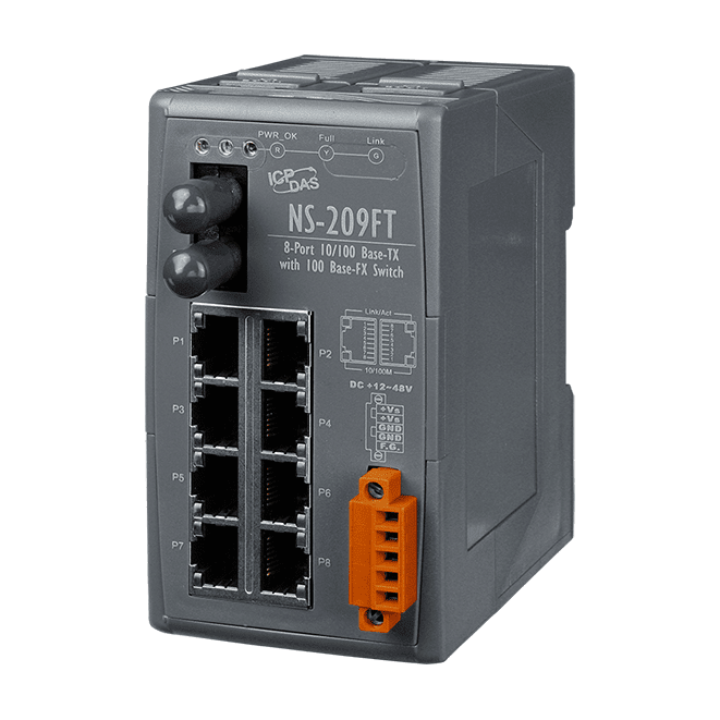 The ICP DAS NS-209FT is a 8-port unmanaged Ethernet with 1 fiber port switch. Using fiber optics prevent noise from interfering with your system and supports high-speed (100 Mbps) and high-distance (up to 2 km) transmission. The NS-209FT provides a wide 10 to 30 VDC power range suitable for common power standards in industrial automation, without external power converters.