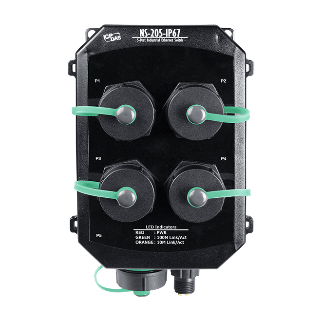 The NS-205-IP67 is designed for industrial applications in harsh environments. The rugged RJ-45 ensure tight, robust connections, and guarantee reliable operation, even for applications that are subject to high vibration and shock.