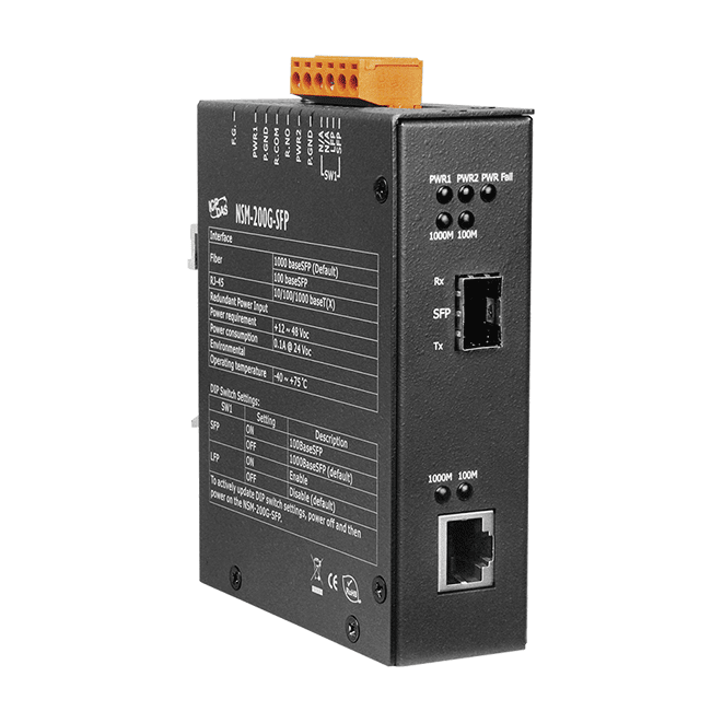 The ICP DAS’s line of feature rich 10/100/1000 Fiber Media Converters transparently connects copper to multimode or single mode fiber. The NSM-200G-SFP is a 10/100/1000 Ethernet to Fiber Converters that provide an economical path to extend the distance of an existing network, the line of non-fiber based equipment, or the distance between two devices. The pluggable fiber optics port allows for flexible network configurations using SFP transceivers supplied by ICP DAS or other manufacturers of MSA (Multi-source Agreement) compliant SFPs. Gigabit Media Converters are also available with support for LFP (Link Fault Pass-through) feature.