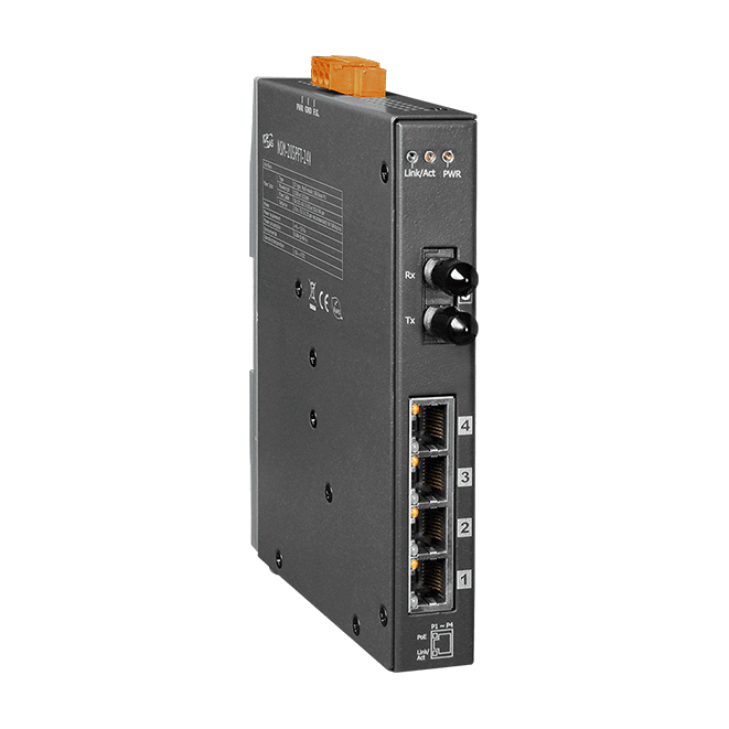 The ICP DAS NSM-205PFT-24V is a 4-port unmanaged PoE (PSE) with 1 fiber port switch; it supports 4 PoE ports which are classified as power source equipments (PSE). The NSM-205PFT-24V makes centralised power supply come true and provides up to 15.4 watts of power per PSE port.